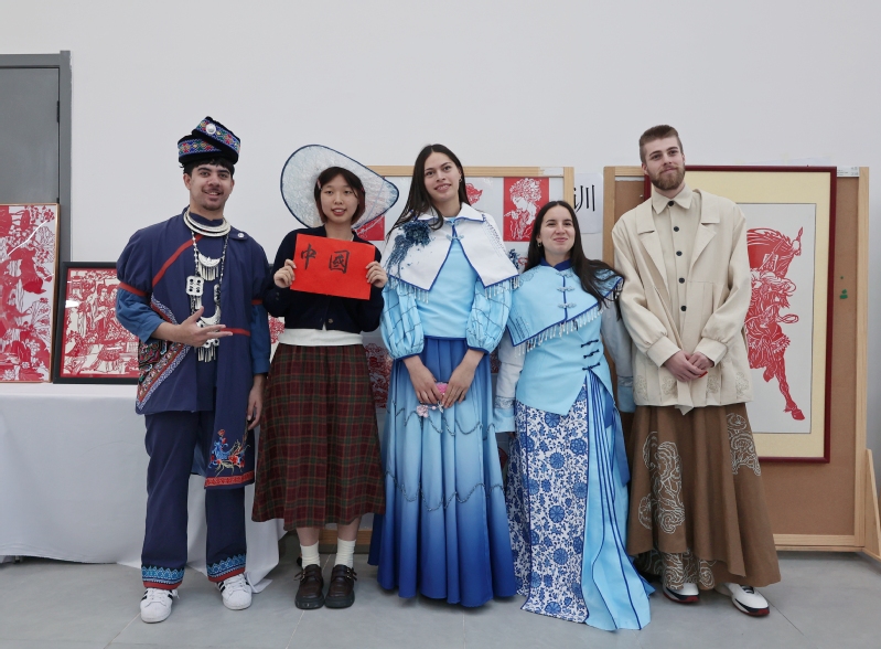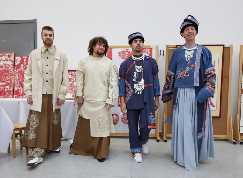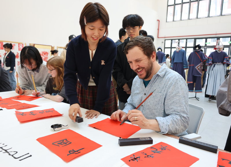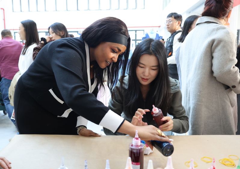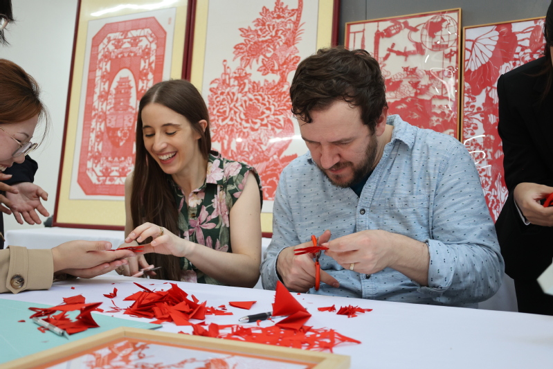 扎染体验区里,新西兰青年Axel Kersel手持纯棉方巾,几经折叠、捆扎,浸入染料后,灵动纹样渐次绽放。“没想到传统技法能做出这么现代的美感!”他举着刚完成的扎染作品,兴奋地向伙伴展示,“这是我第一次亲手制作中国非遗作品,每一步都像在创作独一无二的艺术品,让我真切感受到东方美学的细腻。”剪纸台前,剪刀在中外青年手中流转,《牡丹亭》“蝶戏花”的意象化作一张张精巧剪纸;漆扇体验区,水拓技法让漆液在扇面晕染出自然肌理,青年们还在扇柄题写中文姓名,为作品烙上专属印记;古筝体验区传来悠扬旋律,“勾、抹、托”的指法练习中,《牡丹亭》经典唱段跨越语言障碍,引发全场共鸣;民族服装体验区更是笑语不断,不少青年换上传统服饰,用合影留住这份文化记忆。