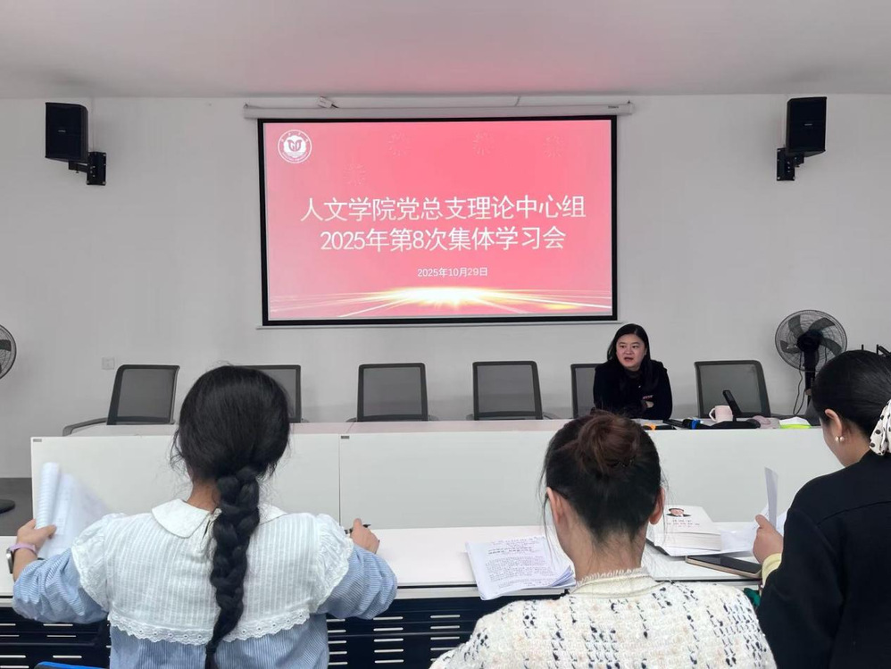 为深入学习贯彻习近平新时代中国特色社会主义思想,进一步提升党员干部理论素养和履职能力,10月29日下午,人文学院党总支在人文楼515会议室召开2025年第8次集体学习会。会议由党总支负责人储瑶主持,党总支委员参加。