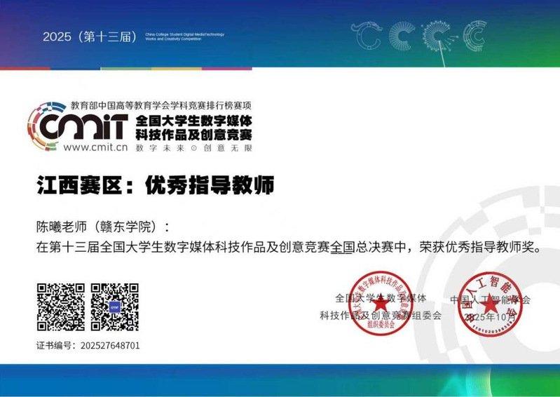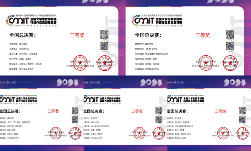 在2025年全国大学生数字媒体科技作品及创意竞赛全国总决赛的激烈角逐中,赣东学院人文学院学子获国家三等奖5项,省级一等奖4项、省级二等奖1项,指导教师获“优秀指导教师奖”。