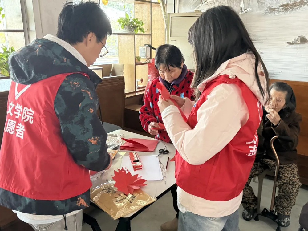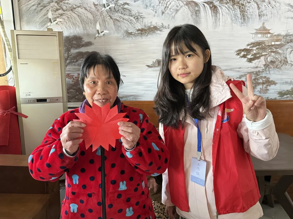 活动中,大家还一起体验了剪纸和书法创作。志愿者一边讲解一边示范,红纸在老人和志愿者的指尖翻折剪裁,渐渐变成一幅幅生动的图案;擅长书法的志愿者展纸挥毫,写下祝福的话语。老人们手捧作品,脸上绽放出灿烂的笑容,一幕幕动人场景在此定格。