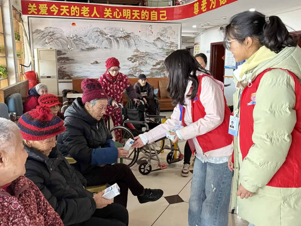 活动开始后,志愿者们分工有序、各尽其责。一部分志愿者将新鲜牛奶双手递到每位老人手中,并细心叮嘱他们注意日常营养;另一部分志愿者则拿起清洁工具,对颐养院的公共区域与老人住所进行了认真打扫——擦拭门窗桌椅、整理日常物品、清除卫生死角,竭力为老人们营造更加整洁、舒适的生活环境。