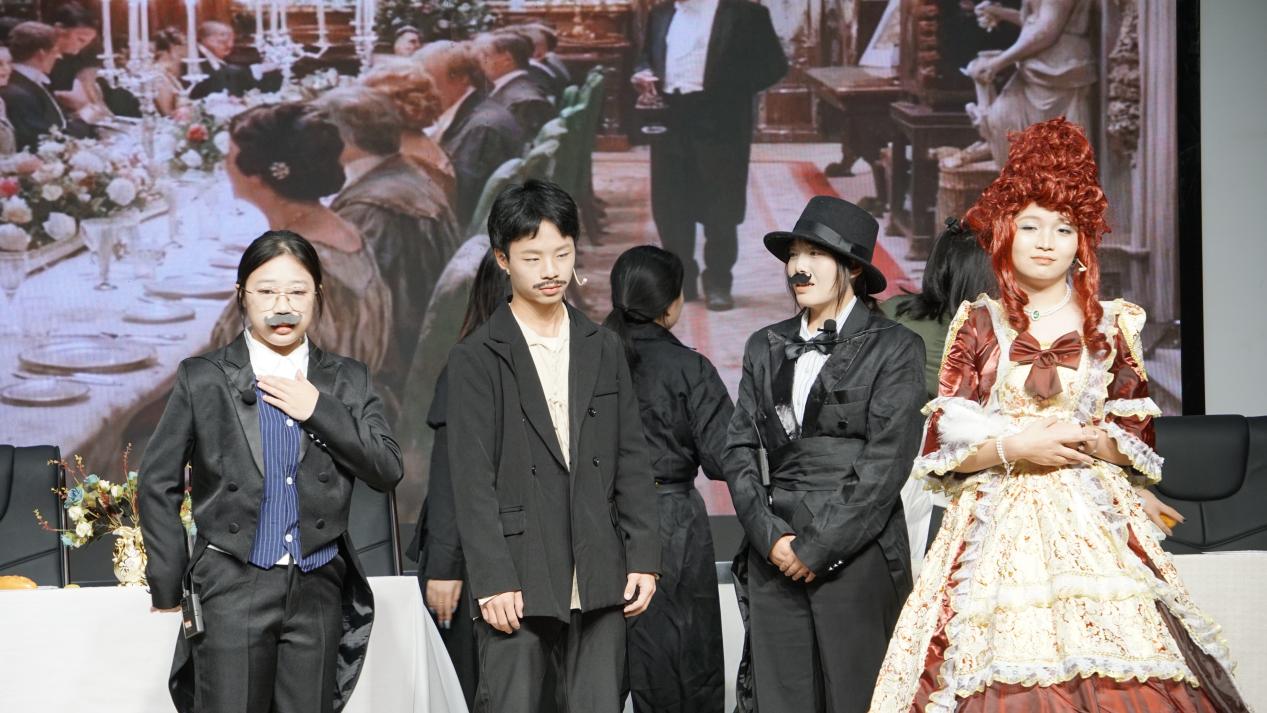 第四场《傲慢与偏见》则带来了英伦风情的浪漫邂逅。学子们精准拿捏角色性格,将伊丽莎白的独立聪慧与达西的傲娇深情演绎得惟妙惟肖,尽显西方文学经典人物的魅力。《一只马蜂》以轻快灵动的节奏登场,剧中青年男女的俏皮试探与啼笑皆非的误会,勾勒出民国时期青年的爱情观与生活态。