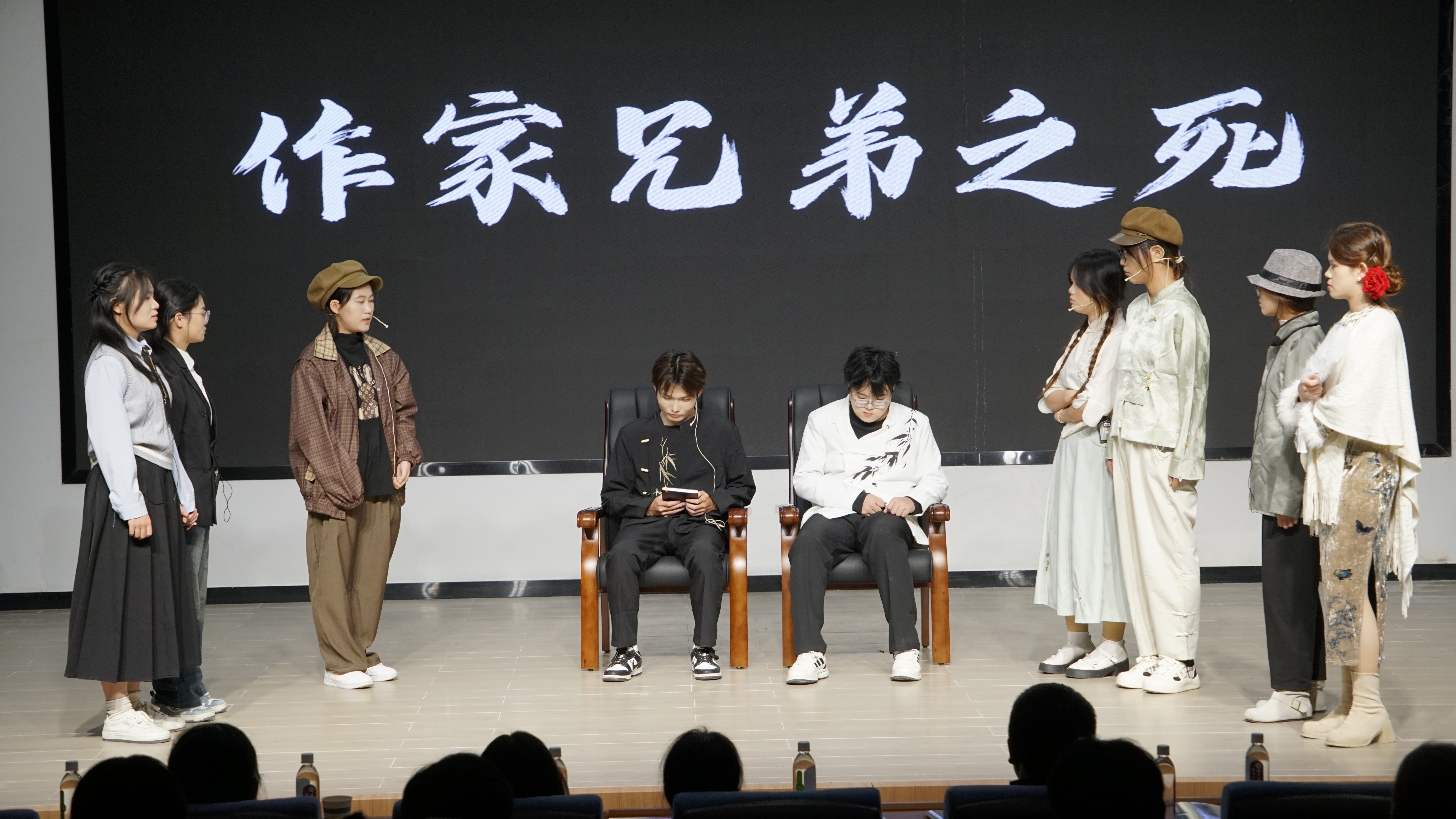 紧接着,《老妇还乡》的暗黑荒诞打破了前序的温婉氛围。演员们以尖锐的戏剧冲突、极具张力的表演,揭露了金钱诱惑下人性的扭曲与道德的崩塌,展现了经典剧目跨越时代的现实意义。《作家兄弟之死》则聚焦于理想与现实的碰撞,生动演绎出作家笔下人物的精神世界,现场氛围轻松活泼,让观众们捧腹大笑的同时不禁思考其中的哲思。