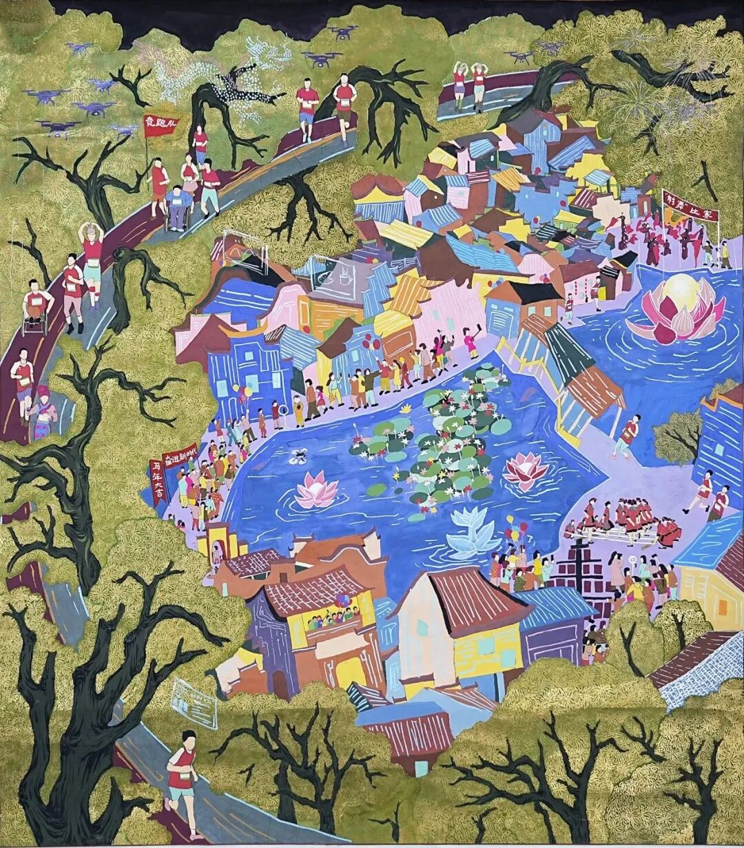 △年画《数智古村·跑出新时代》以乐安流坑古村马拉松为线索,将传统村落的文化气韵与当代科技生活融为一体。郑艺豪 作