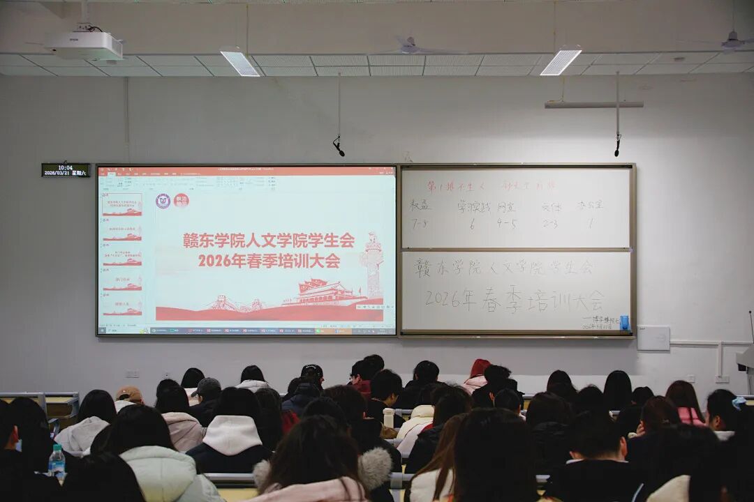 为进一步加强学生组织队伍建设,提高学生干部整体综合素质与服务能力,2026年3月21日上午十点,赣东学院人文学院学生会在博学楼阶七教室举办2026年春季培训大会。本次大会由办公室工作人员高朱薄媛主持,学生会全体成员参会。