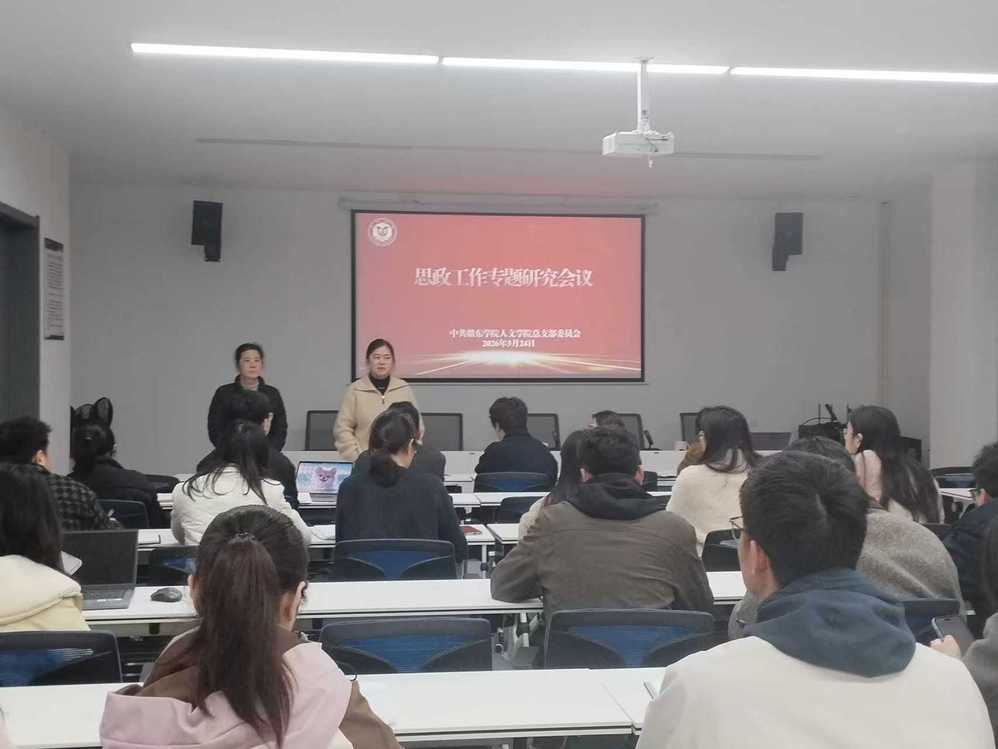 为深入落实立德树人根本任务,认真践行习近平总书记关于教育的重要论述,切实加强和改进新形势下大学生思想政治教育工作,培养担当民族复兴大任的时代新人,3月24日下午,人文学院在人文楼 515 会议室召开思政工作专题研究会。会议由党总支书记储瑶主持,党政领导班子、党总支委员、各系及专业负责人、全体辅导员、班主任参加会议。