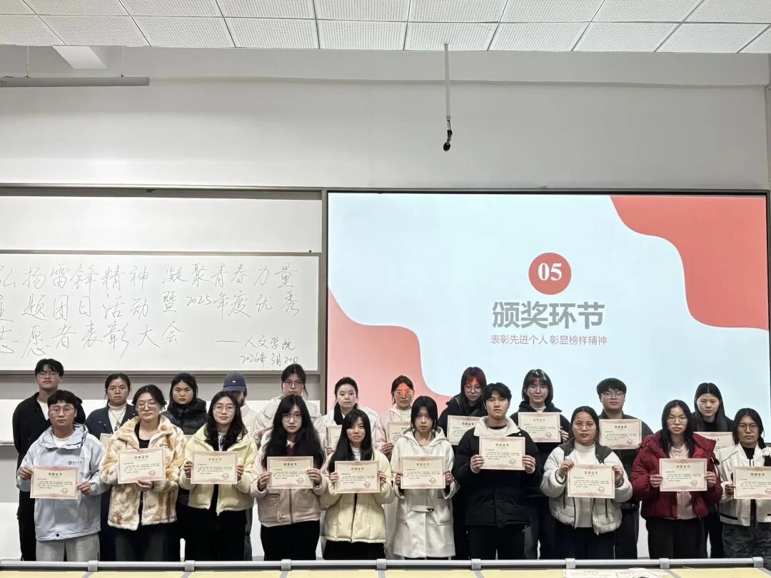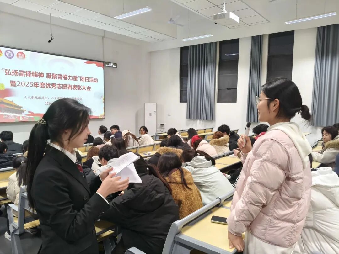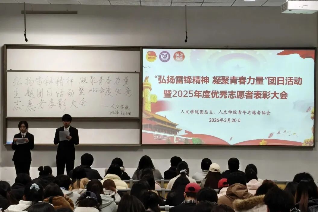 3月20日,人文学院青年志愿者协会在博学楼阶八教室举办“弘扬雷锋精神 凝聚青春力量”主题团日活动暨2025年度优秀志愿者表彰大会。活动通过观看雷锋主题纪录片、开展知识问答互动、志愿者代表分享暑期“三下乡”及“返家乡”实践故事等环节,重温雷锋事迹、传递志愿精神,并为优秀实践队和先进个人颁发荣誉证书。大会以表彰树典型、以榜样引前行,激励青年学子将雷锋精神融入日常,为学校本科教学工作合格评估凝聚青春力量。