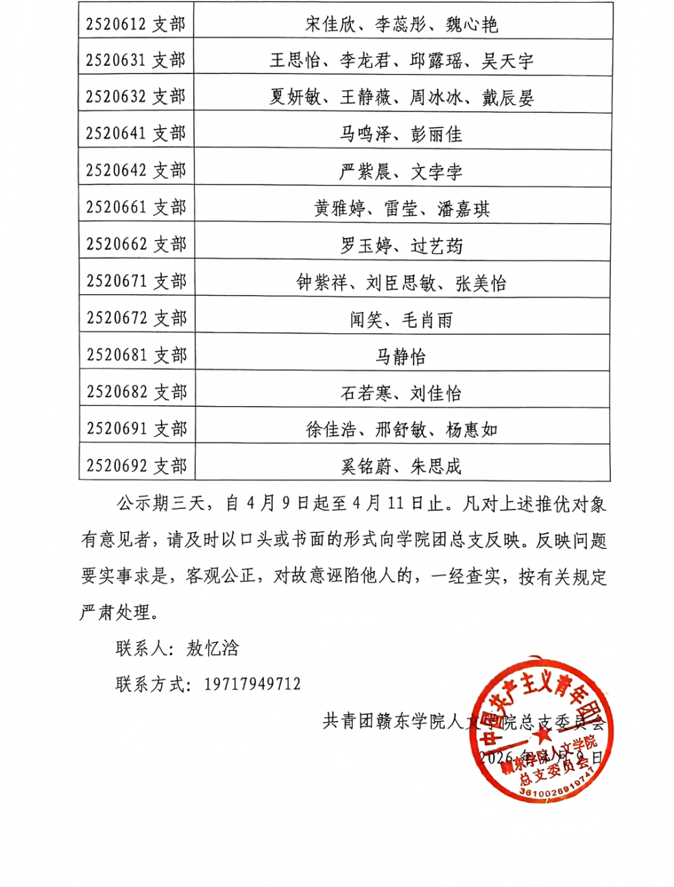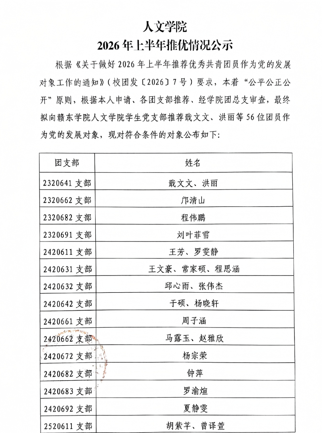 根据《关于做好2026年上半年推荐优秀共青团员作为党的发展对象工作的通知》(校团发〔2026〕7号)要求,本着“公平公正公开”原则,根据本人申请、各团支部推荐、经学院团总支审查,最终拟向赣东学院人文学院学生党支部推荐戢文文、洪丽等56位团员作为党的发展对象,现对符合条件的对象公布如下: