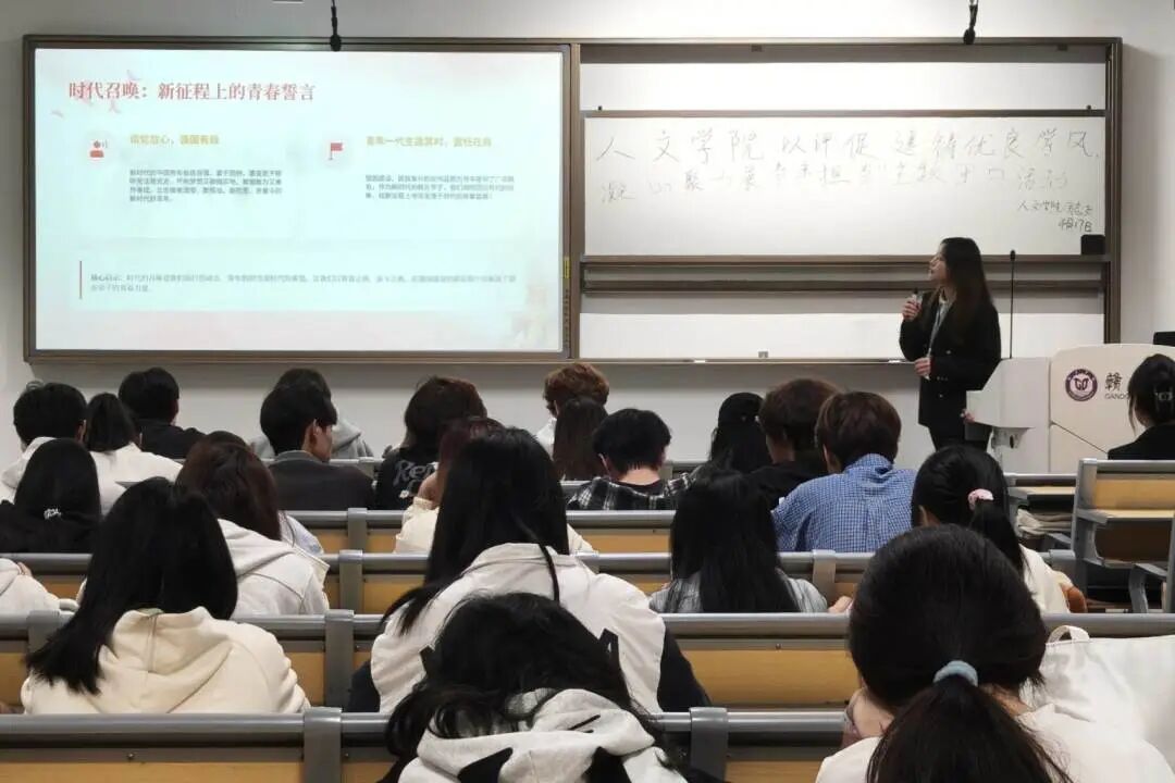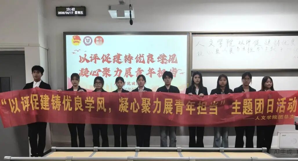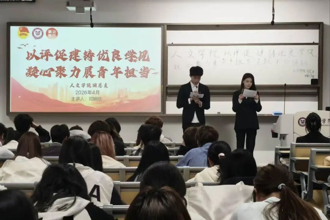 为扎实推进学校迎评促建工作,助力学校本科教学工作合格评估高质量通过,进一步加强学院学风建设。赣东学院人文学院于2026年4月17日晚七点,在勤学楼105教室开展“以评促建铸优良学风 凝心聚力展青年担当”主题团日活动,2025级服装与服饰设计专业全体学生参与本次活动,李宇欣、马鸣泽主持。